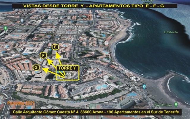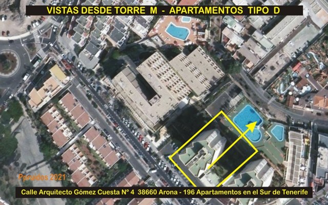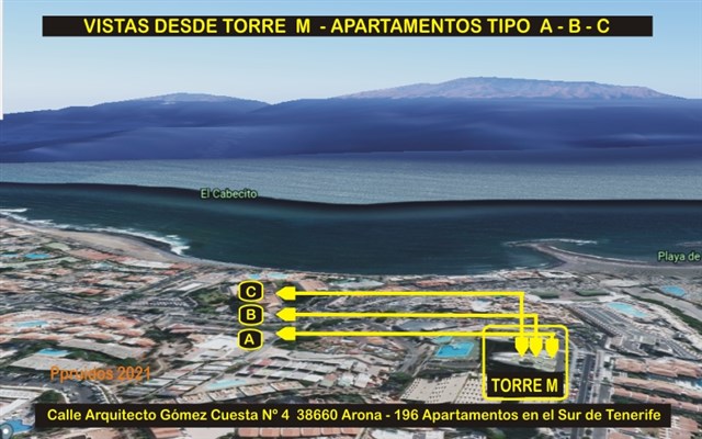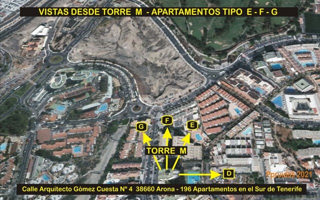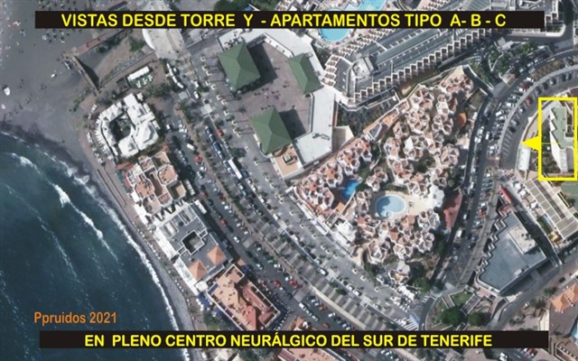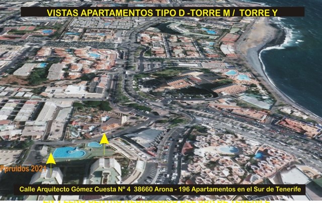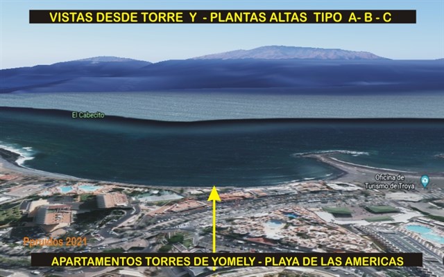 Si esta situado en la Torre M, las vistas son a Piscina, Playa de las Americas Sureste yJardines. La Torre Y tiene vista Mar, Gomera, Zona Comercial.