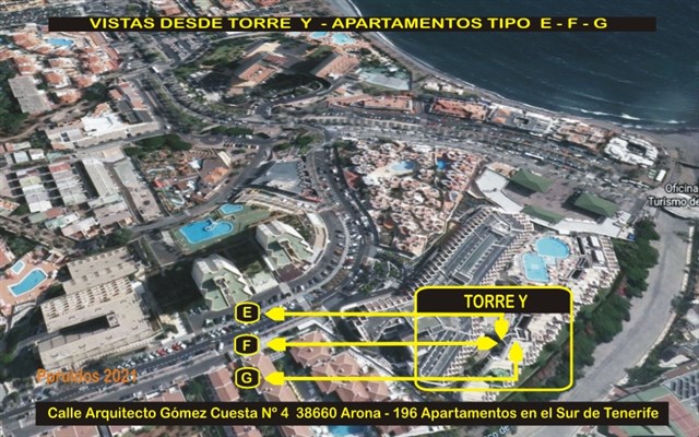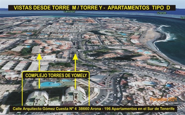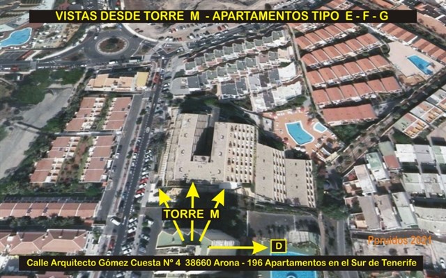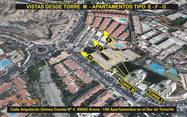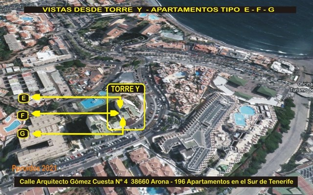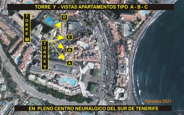 Si esta situado en la Torre M, las vistas son a Piscina Playa de las Americas Sureste y Jardines. La Torre Y tiene vista Mar, Gomera, Zona Comercial.